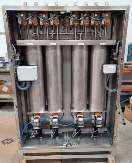 Sistema de dosagem para a pesagem e descarga por gravidade permitindo mistura do valor ideal medido com precisão através de células de carga.